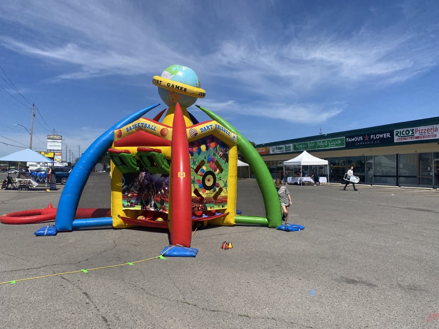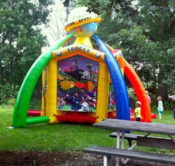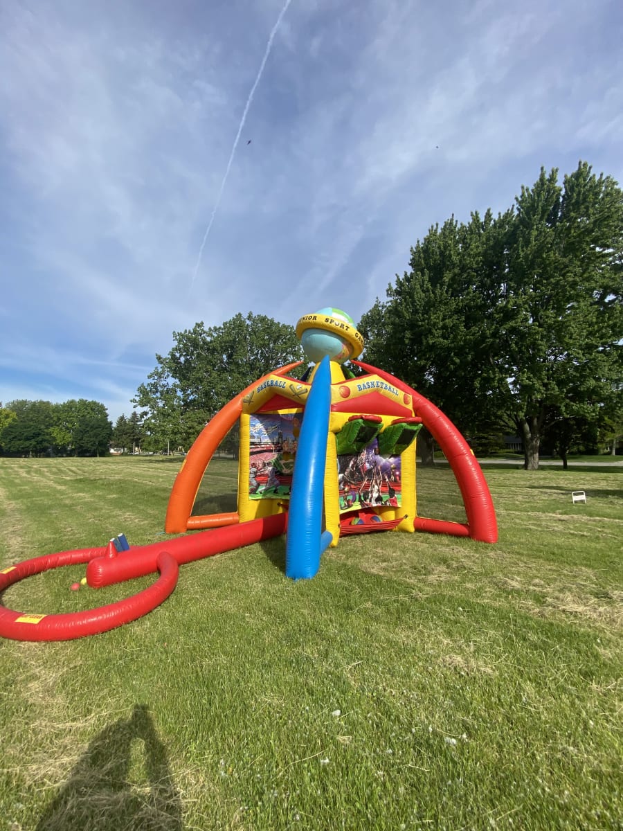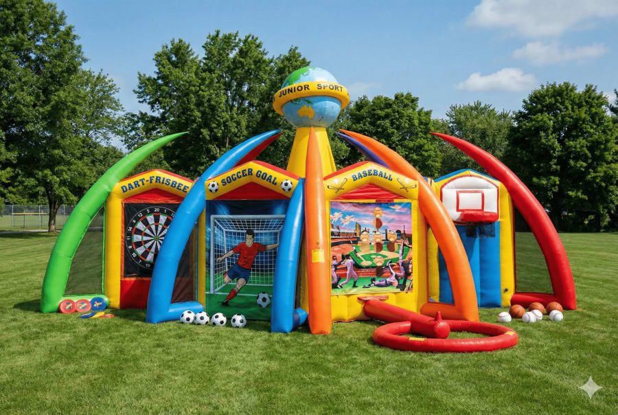 The 6 in 1 Sports Center delivers high-energy fun for schools, corporate events, fundraisers, and sports days. This versatile inflatable station hosts four players at once. It combines soccer, football, basketball, frisbee, velcro darts, and a hovering baseball tee into one compact footprint. Fast setup. Big impact. Perfect for crowd engagement and team challenges.